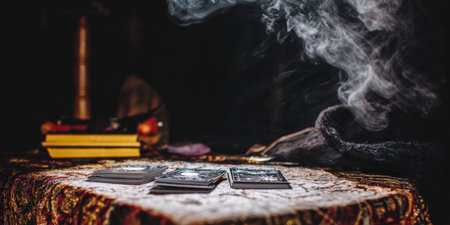 Tarot cards, symbolizing destiny and prophecy, laying on an ornate table, surrounded by ethereal white smoke and creating a mysterious atmosphere for fortune telling and esoteric rituals
