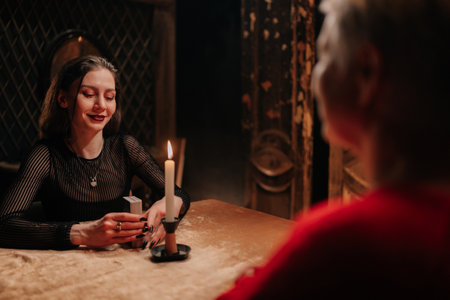 Woman fortune-teller guesses fate of night at table with candles