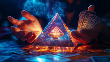 Mystical hands hover over a glowing pyramid while tarot cards rest on a table in a dimly lit space