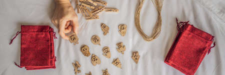 Modern, minimal still life with runes and tarot cards on table. Magic ritual, esoteric and occult background with copy space. Reading future concept.