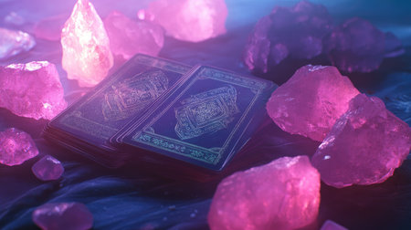 Tarot cards and pink crystals on a dark, softly lit surface, a serene and magical setup for spiritual exploration.