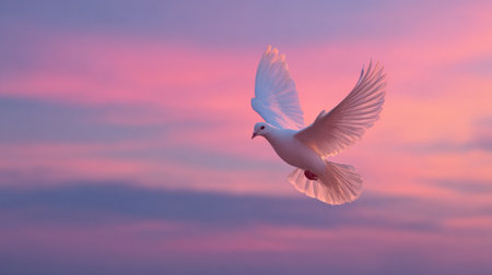 A white peace dove glides effortlessly through an expansive gradient sky filled with soft hues of pink and purple, embodying freedom and hope.
