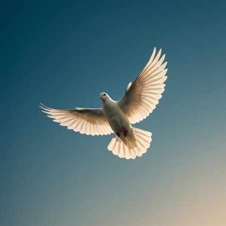 White dove soaring gracefully against a serene blue sky, symbolizing peace, hope, and spirituality