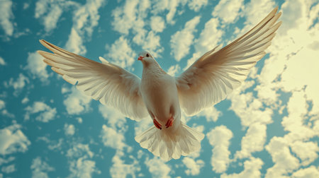 Elegant white dove against a bright blue sky with soft clouds, symbolizing peace and tranquility in nature.