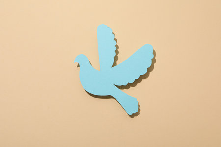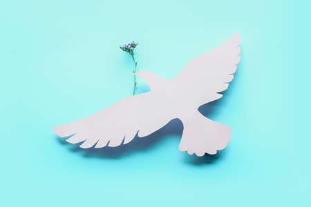 A dove stencil with a twig, cut out of white paper on a blue background for World Peace Day. World Science Day for Peace and Development.