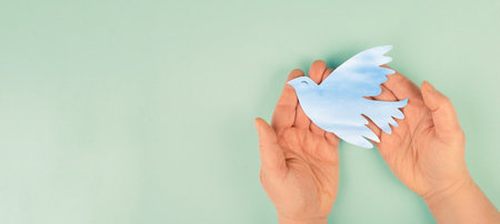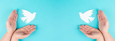 Holding a white dove in the hands, symbol of peace, paper cut out pigeon, copy space for text, blue colored background