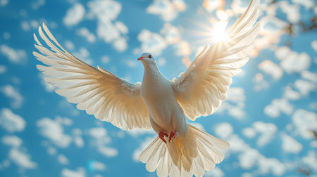 A white dove in the blue sky air with wings wide open in front of the sun. Freedom concept and international day of peace. Generative Ai