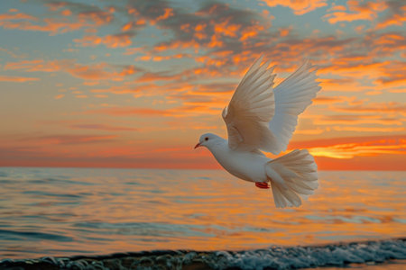 White dove flying over the sea at sunset, soft clouds illuminated by orange and pink hues in the background create a serene and peaceful atmosphere ideal for symbolism of hope and freedom