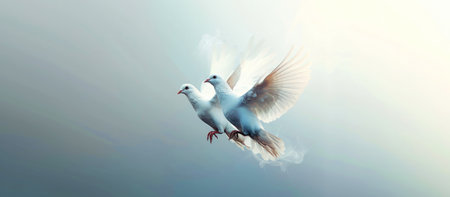 Captivating image of two white doves soaring in the sky, their wings spread wide, symbolizing peace and freedom. A beautiful moment captured in nature.