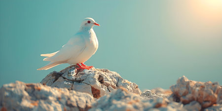 Majestic white dove perched against a clear blue sky, symbolizing peace and tranquility. The bird gazes thoughtfully, embodying serenity and grace.