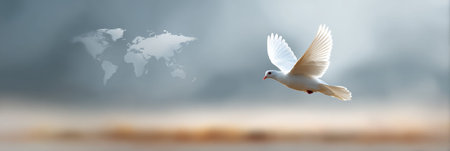 White dove flying over blurred landscape with world map silhouette in background, representing concepts of peace, hope, freedom, and global unity