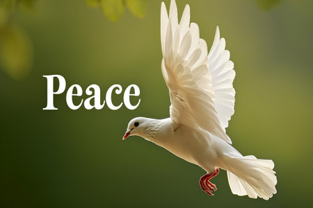 A powerful image suited for peace campaigns, motivational posters, or inspirational content | The photograph presents a magnificent white dove in mid-flight, with the word Peace adorning the upper portion. The dove, with its wings outstretched, embodies purity and grace against the soft, bokeh background of verdant green. Each feather is captured with such clarity that the intricate details and textures are vividly seen, conveying a sense of movement and freedom. The subtle gradient of light to shadow across the image juxtaposes the dove's symbolism of light and hope in dark times. The placement of the dove in the frame exudes dynamism while maintaining a harmonious balance, illustrating the possibility of serene coexistence. The inclusion of the text Peace in a simple and elegant font reinforces the universal message of tranquility and harmony that the dove represents | This image would excel within editorial pieces discussing the concept of peace, in educational materials regarding symbolism, or as an evocative visual in meditation and wellness spaces. It is also perfectly suited for use in advocacy for peaceful resolutions and could complement articles in religious and philosophical contexts. This representation of peace could furnish workspaces and homes alike with a reminder of gentleness and non-violence, serving as an inspiration for unity and compassion | a photograph capturing the serene essence of a white dove in flight with a blurred green background, including the word Peace, representing hope and the aspiration for harmony under soft lighting which highlights the textures of the dove's feathers, with space for textual or graphic additions