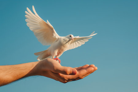 A serene close-up captures the moment of a white dove taking flight from a human hand against a clear blue sky, symbolizing peace and freedom