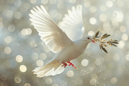 White dove gracefully holds olive branch in its beak, perched among lush green foliage. serene atmosphere evokes sense of peace and tranquility, symbolizing hope and harmony