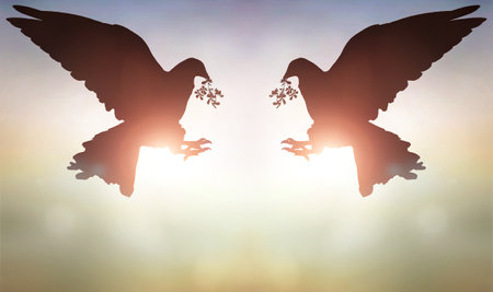 peace and hope concept, silhouette of bird carrying leaf branch on sunset background