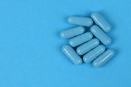Blue medical capsules pill on blue background. High resolution photo. Full depth of field.