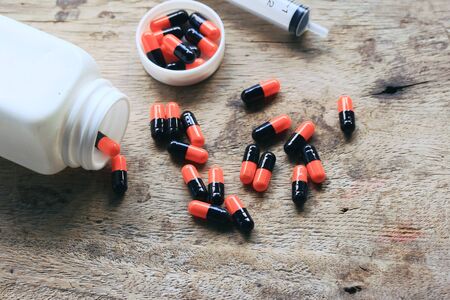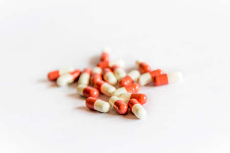 Selective focus on pink-white capsule pill fall down to white table. Antibiotic drug use with reasonable. Antibiotic drug resistance. Pharmaceutical industry. Antimicrobial drug market. Drug overuse.