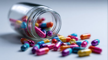 Vibrant capsules in various colors scatter from a glass jar onto a light surface, showcasing their unique shapes and designs in an inviting setup.