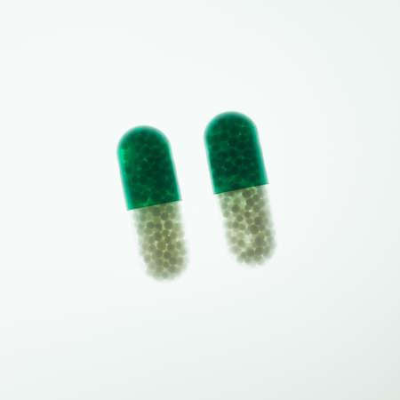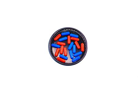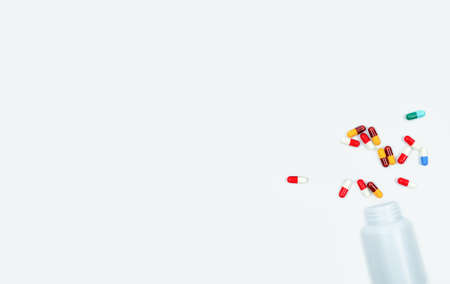 Colorful capsule pills on isolated white background with copy space. Antibiotic drug resistance. Pharmaceutical industry. Antimicrobial resistance concept. Top view.