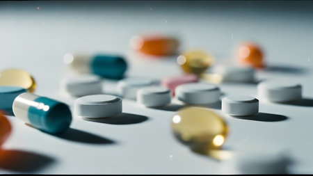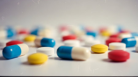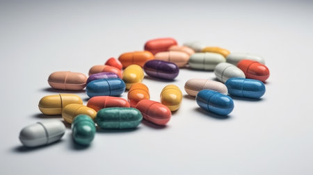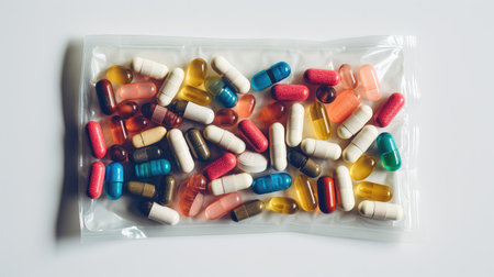 A heap of assorted pills on a blank background. Created with Generative AI technology