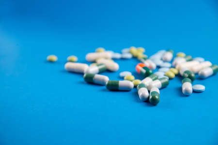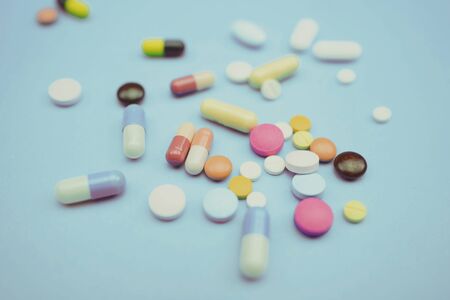 Heap of colorful pills, tablets, capsules on blue background. Drug prescription for treatment medication health care concept wth copy space
