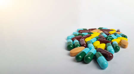 Oral medication background with warm light.Colorful of oral medications on White Background.