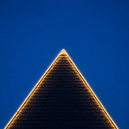 A striking modern structure emerges against a backdrop of a deep blue sky at dusk, highlighting geometric lines and innovative architecture in an urban setting.