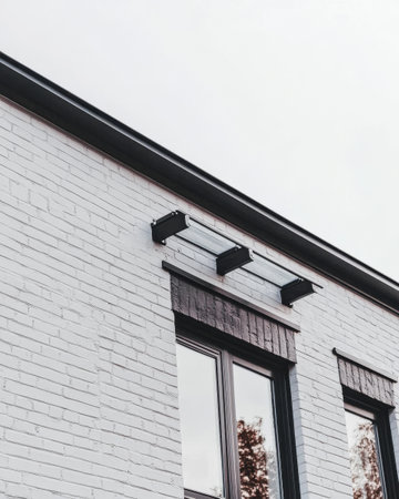 This structure showcases a clean white brick facade highlighted by black accents large windows and simplified architectural elements.