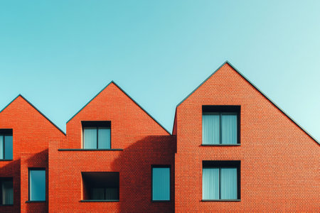 Red brick apartment building with triangular roofs and large windows against a clear blue sky, representing modern architecture and urban living