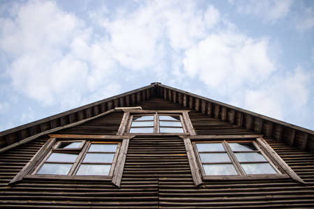 Wooden gabled roof with blue sky,triangles roof house sky background