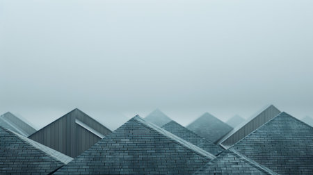 This image captures modern residential architecture featuring unique gable roofs, set against a vivid blue sky embellished with soft clouds. The design showcases clean lines and a minimalist aesthetic, highlighting the beauty of contemporary living spaces.