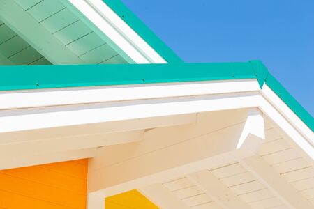 A close-up captures a white building facade with a terracotta tiled roof section. The composition showcases a strong contrast with the clear, vibrant turquoise sky. The scene is bathed in bright daylight creating sharp shadows. Suitable for various design projects, this image offers copy space for diverse applications.