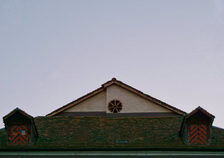 Colorful tiled roof with architectural patterns, ample sky space for copy