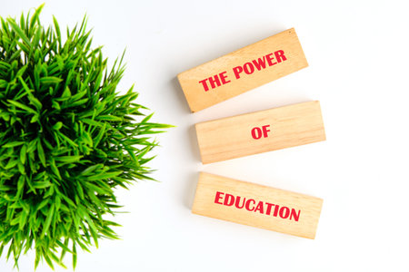 Business and Words Matter concept. Copy space. THE POWER OF EDUCATION made of wooden blocks on white background with green plant, top view
