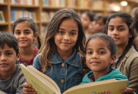 Group of children reading together in a library. Education and curiosity in a group setting.