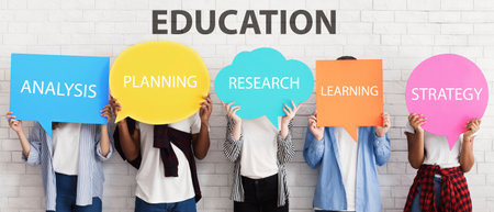 Study together. International students exchange. School knowledge. Talent development. Student ready for lessons. Regular school program. School education for advanced level. Easy learning concept