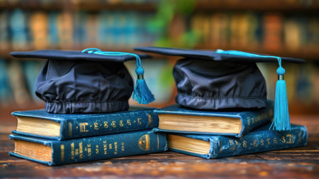 A graduation cap rests on a stack of books beside a growth chart made of blocks. This scene symbolizes academic success and the journey of education highlighting achievement.