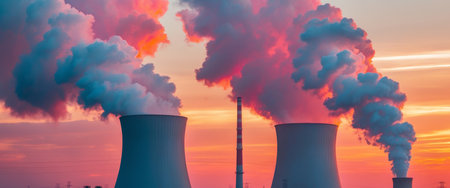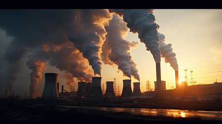 AI Generated. Power plant cooling towers emitting smoke at sunset
