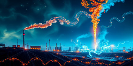 A striking industrial scene under a stormy night sky, featuring dramatic lightning illuminating smoke and flames from factories amidst environmental concerns.