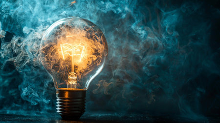 A glowing light bulb surrounded by swirling smoke, set against a dark background, creating a moody and artistic composition emphasizing warmth and creativity.