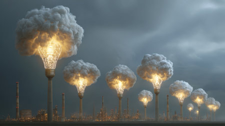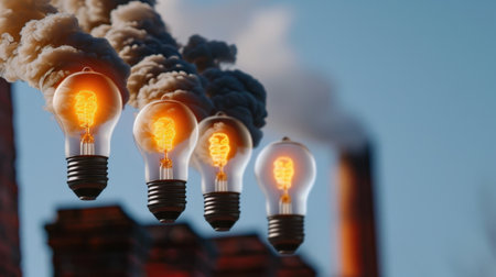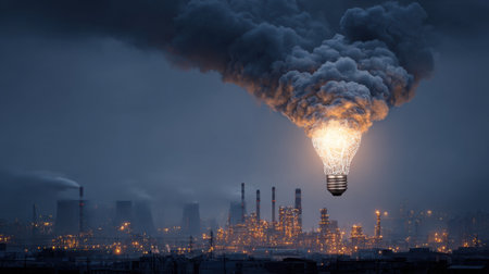 An imaginative scene showing a glowing light bulb releasing smoke above an industrial cityscape, highlighting the contrast between energy and pollution at dusk.