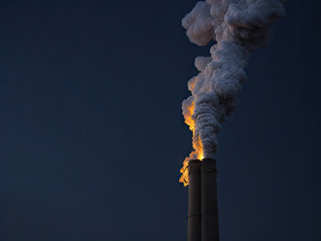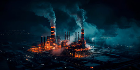 manufacturing facility with multiple chimneys releasing smoke, symbolizing environmental impact.