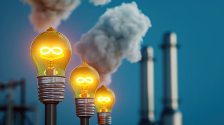 This image depicts glowing light bulbs representing renewable energy against a backdrop of industrial pollution, highlighting the need for eco-friendly innovations in technology.