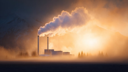 a golden sunset casting light on industrial smokestacks emitting plumes of smoke, showcasing the interplay between nature s beauty and industrial influence.