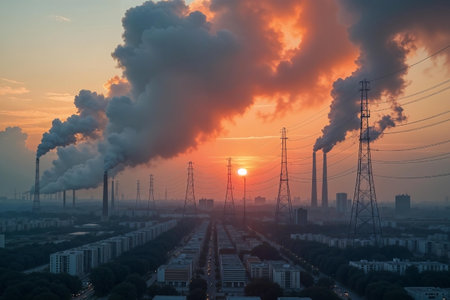 A vibrant sunset casts dark hues over an industrial skyline, filled with smoke and reflecting the impact of pollution. The scene captures an atmospheric contrast.