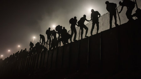 People are seen climbing a tall border wall under dim lights at night, navigating the obstacles that stand in the way of achieving their dreams, highlighting the struggle for a new beginning.