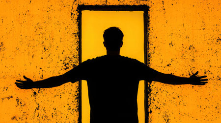 A striking silhouette of a man stands in a radiant golden doorway, arms wide open, embodying themes of freedom and exploration against a textured backdrop.