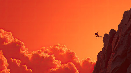A daring climber jumps from a rocky cliff into the vastness below, framed by a breathtaking orange sky filled with dramatic clouds, capturing the essence of adventure and freedom.