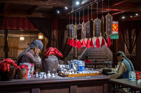 Beautiful and high-born geisha holds a Chinese tea ceremony with an elite tea set in an aristocratic rich hall.