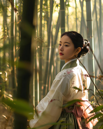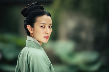 Elegant woman in traditional attire looks over her shoulder, set against a soft-focus nature scene. Her hair is styled in an intricate updo, enhancing her graceful and poised expression